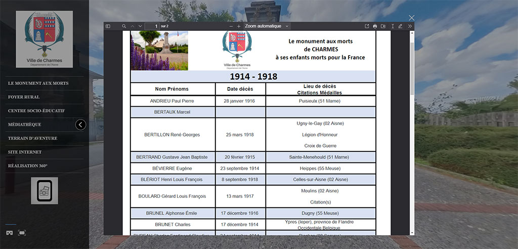 La visite virtuelle 360° du Monument aux Morts de Charmes vous permet d’approfondir votre compréhension historique. Découvrez les noms inscrits sur le monument, visualisez-le sous différents angles et téléchargez des documents informatifs pour une expérience à la fois éducative et commémorative.