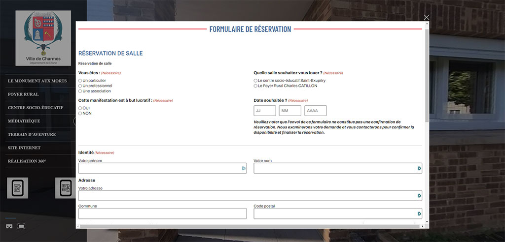 Visitez le Centre Saint-Exupéry grâce à sa visite virtuelle 360°. Explorez les installations, découvrez les pièces et équipements, pour vos prochaines réunions de famille, d’association, ou de travail. Une fonctionnalité pratique vous permet de faire des demandes de réservation directement depuis la visite.